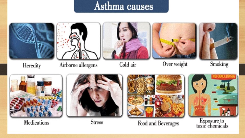 CAUSES- Triggers 1. Allergens- pollens, dandruff, dust, animals fur 2. Iritants-fumes, smoke, paint 3. Certain drugs-Aspirin, β blockers etc. 4. Cold air, dry whether 5. Stress 6. Exercise 7. Family history of asthma (Genetic)
