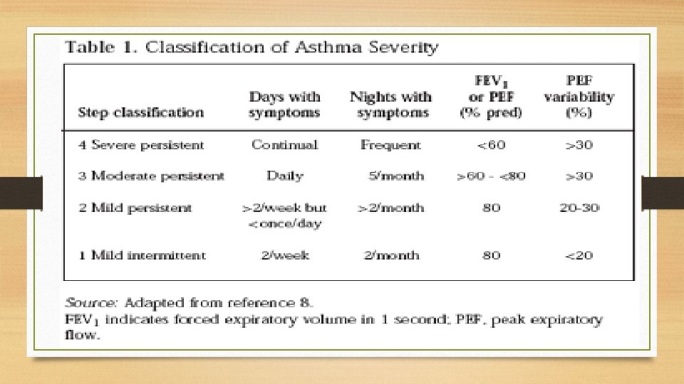 Goals of Asthma management • Control symptoms so as to maintain normal activity levels including exercise. • • • Maintain pulmonary function as close to normal levels as possible. Avoid asthma triggers by educating patients Plan for the prevention & management of exacerbations. Avoid adverse effects from asthma medications. Prevent development of irreversible airway obstruction& reduce asthma mortality.