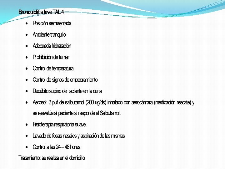 CLASIFICACIÓN DE GRAVEDAD: PUNTAJE DE TAL PUNTAJE FC FR < 6 meses > 6 meses Sibilancias Retracción Costal 0 Menos de 120 < 40 > 30 no 1 120 – 140 40 a 55 30 a 45 Fin de la espiración Leve intercostal 2 140 – 160 56 a 70 46 a 60 Inspiración y espiración Tiraje generalizado 3 Más de 160 > 70 > 60 Audible sin estetoscopio o ausentes Tiraje y aleteo nasal