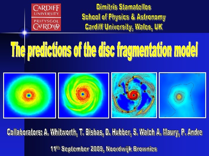 Conclusions § Discs can fragment at R>70 AU to form extremely low-mass stars (planetary-mass objects, brown dwarfs and low-mass hydrogen burning stars). § This model can reproduce the brown dwarf desert and the binary properties of low-mass objects. § As one star/disc can produce a few low-mass objects, only 10 -20% of Sun-like stars having massive extended discs that fragment can produce most of brown dwarfs and a significant number of low-mass H-burning stars.