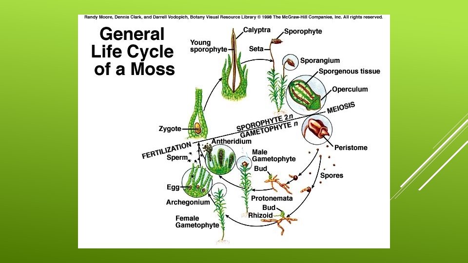 MOSS LIFE CYCLE Alternates between a haploid gametophyte (n) and diploid sporophyte (2 n) phase. The gametophyte is the larger more obvious and longer-lived generation of mosses. The gametophyte produces eggs and sperm