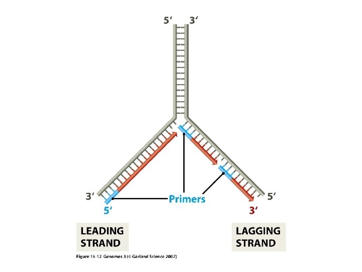 Summary DNA Replication • Occurs during S phase of the cell cycle • Semi-conservative (Meselson & Stahl) • 5’ → 3’direction leading strand lagging strand (discontinuous) RNA primer