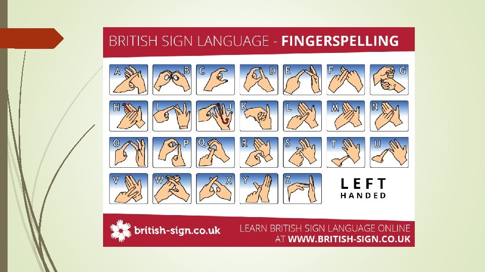 What is British Sign Language? Visual means of communicating using hand shapes and gestures, facial expression and body language It’s mainly used by Deaf people and people with hearing difficulties There is opposition to BSL Sign language has become more accepted over the years Around 145, 000 people within the UK use BSL.