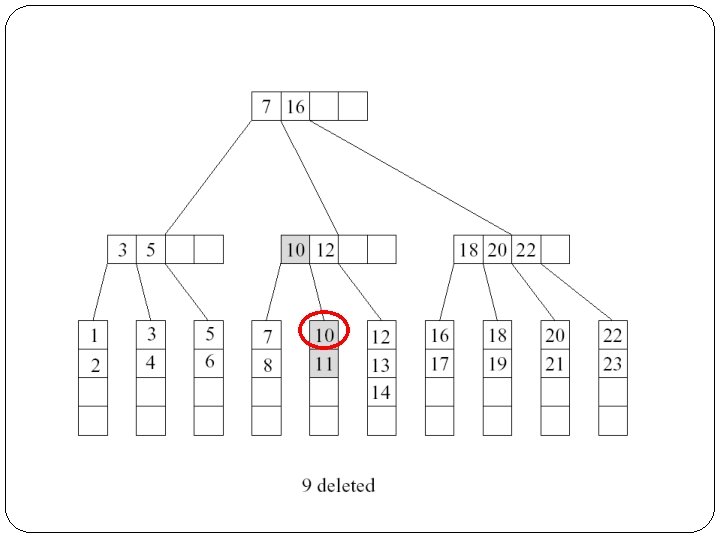 Deletion Find and delete in leaf May have too few nodes. Do reverse of add (pull down and slap together) BUT, it could be that when you combine neighbor nodes, you get a node that is too large. Then, you would have to split it apart. Better to shift some of the records from a neighbor into the leaf that is too small.