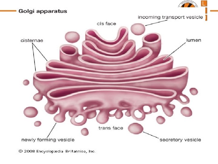 Golgi Apparatus • Collection of Golgi bodies • Cisternae – stacked membrane folds • Front - Cis , Back – Trans • Collect, package, and distribute molecules synthesized at one location in the cell and utilized at another location • Vesicles from the endoplasmic reticulum fuse with the network and subsequently progress through the stack to the trans Golgi network, where they are packaged and sent to their destination