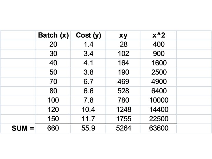 Our linear regression equation: y c = a + bx yc= What is the cost of a batch of 125 pieces? yc=