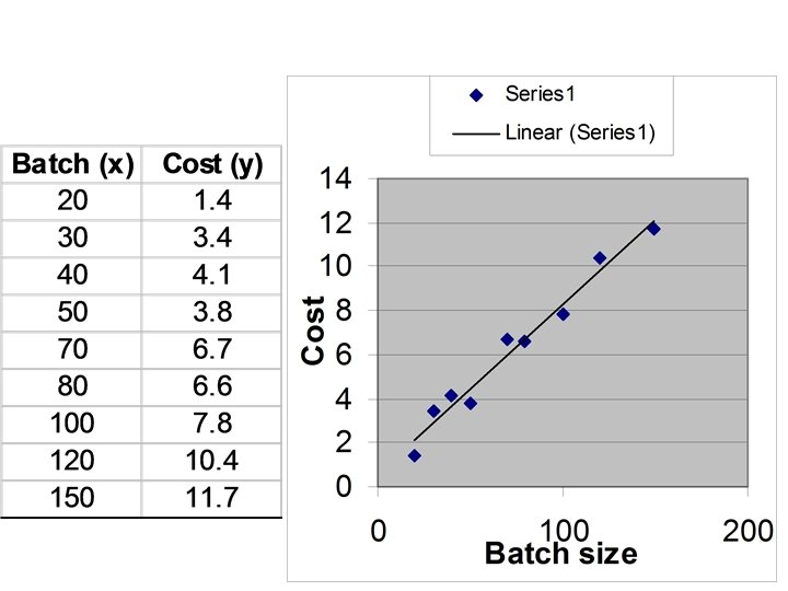 Example 5 - Linear Regression: Suppose that a manufacturing company made batches of a certain product. The accountant for the company wished to determine the cost of a batch of product given the following data: Size of batch 20 30 40 50 70 80 100 120 150 Cost of batch (in 1000 s) $1. 4 3. 4 4. 1 Question… which is 3. 8 the dependent (y) and 6. 7 which is the independent 6. 6 (x) variable? 7. 8 10. 4 11. 7