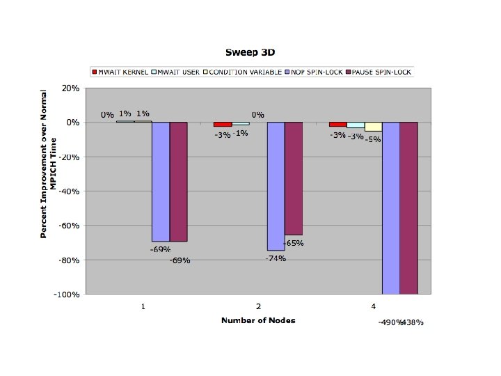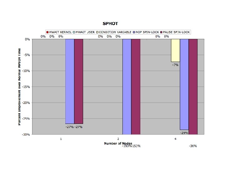 Modified MPICH Evaluation Benchmarks • s. PHOT – Very light network activity (Gather/Scatter 2 x) • s. PPM – Exclusively isend/irecv , few messages, – large packets - (30 MB total/thread) • SMG 2000 – Isend, Irecv - High message volume, small packets • IRS – Gather/Scatter/Bcast Predominate • Sweep 3 D – Send/Recv - Medium volume of messages