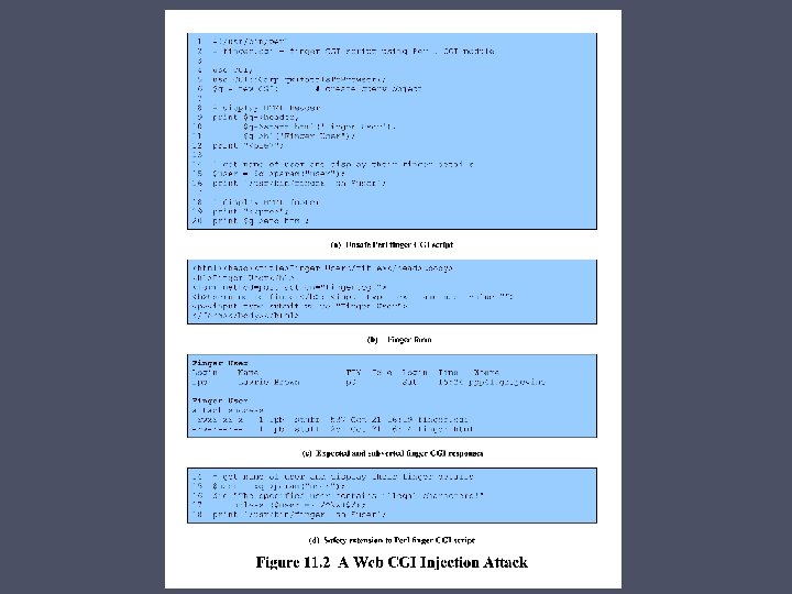 Injection Attacks • Flaws relating to invalid handling of input data, specifically when program input data can accidentally or deliberately influence the flow of execution of the program Most often occur in scripting languages • Encourage reuse of other programs and system utilities where possible to save coding effort • Often used as Web CGI scripts