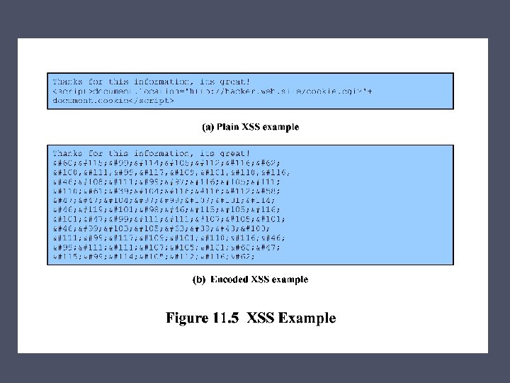 Cross Site Scripting (XSS) Attacks Commonly seen in scripted Web applications Attacks where input provided by one user is subsequently output to another user • Vulnerability involves the inclusion of script code in the HTML content • Script code may need to access data associated with other pages • Browsers impose security checks and restrict data access to pages originating from the same site Exploit assumption that all content from one site is equally trusted and hence is permitted to interact with other content from the site XSS reflection vulnerability • Attacker includes the malicious script content in data supplied to a site