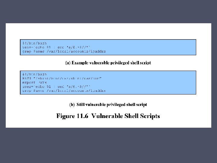 Vulnerable Compiled Programs can be vulnerable to PATH variable manipulation • Must reset to “safe” values If dynamically linked may be vulnerable to manipulation of LD_LIBRARY_PATH • Used to locate suitable dynamic library • Must either statically link privileged programs or prevent use of this variable