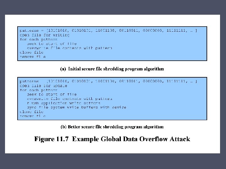 Correct Algorithm Implementation • Issue of good program development technique o Algorithm may not correctly handle all problem variants o Consequence of deficiency is a bug in the resulting program that could be exploited • Example: a Netscape bug. o Initial sequence numbers used by many TCP/IP implementations are too predictable o Combination of the sequence number as an identifier and authenticator of packets and the failure to make them sufficiently unpredictable enables the attack to occur • Another variant is when the programmers deliberately include additional code in a program to help test and debug it o Often code remains in production release of a program and could inappropriately release information o May permit a user to bypass security checks and perform actions they would not otherwise be allowed to perform o This vulnerability was exploited by the Morris Internet Worm