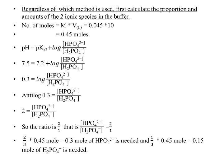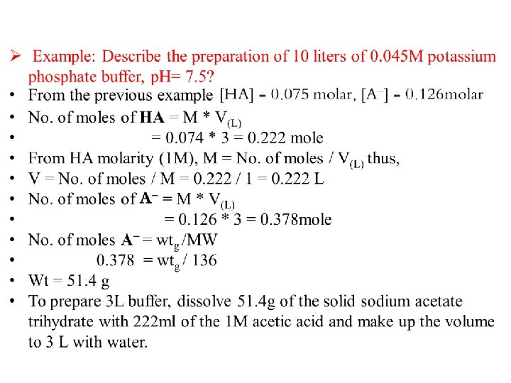 Ø Example: Describe the preparation of 10 liters of 0. 045 M potassium phosphate buffer, p. H= 7. 5? p. Ka 1= 2. 12 , p. Ka 2= 7. 21 , p. Ka 3= 12. 32? . • H 3 PO 4 H+ + H 2 PO 4 - H+ + HPO 42 - H+ + PO 43 - • The p. H > Ka 2 thus, the 2 major ionic species present are H 2 PO 4 - (conjugate acid) and HPO 42 - (conjugate base) with the HPO 42 predominating. • The buffer can be prepared by several ways as: 1. by mixing KH 2 PO 4 and K 2 HPO 4 in proper proportions. 2. by starting with KH 2 PO 4 and converting a portion of it into K 2 HPO 4 by adding KOH. 3. by starting with K 2 HPO 4 and converting a portion of it into KH 2 PO 4 by adding strong acid as HCl.