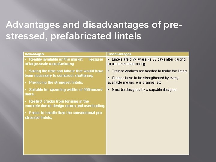 Advantages and disadvantages of prestressed, prefabricated lintels Advantages Disadvantages • Readily available on the market because • Lintels are only available 28 days after casting of large-scale manufacturing to accommodate curing. • Saving the time and labour that would have • Trained workers are needed to make the lintels. been necessary to construct shuttering. • Shapes have to be strengthened by every • Producing the strongest lintels. available means, e. g. cramps, etc. • Suitable for spanning widths of 900 mmand more. • Restrict cracks from forming in the concrete due to design errors and overloading. • Easier to handle than the conventional prestressed lintels, • Must be designed by a capable designer.