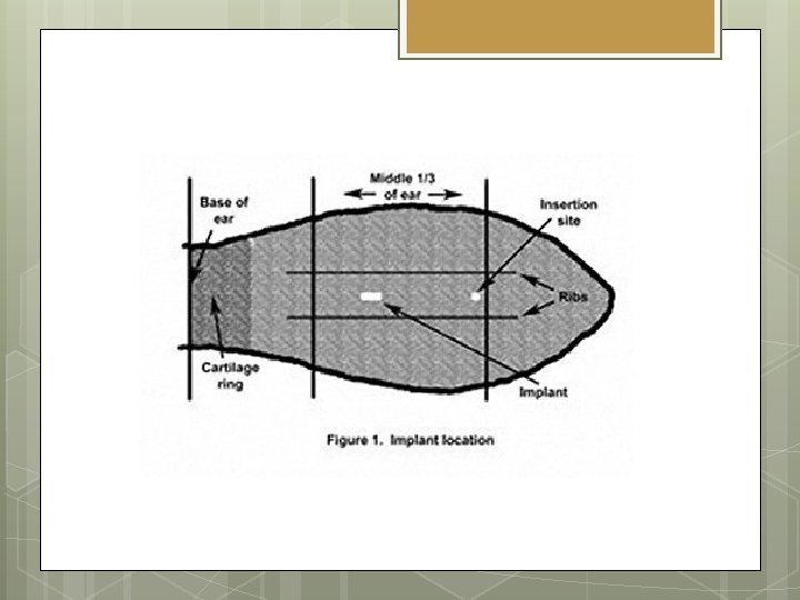 Technique Store implants strips that are open in a sealed container in the refrigerator. If the ear is dirty, scrub clean with a brush and bucket of disinfectant If the ear is wet, dry it Palpate the implant after installation to ensure it is sub. Q and press the needle hole closed