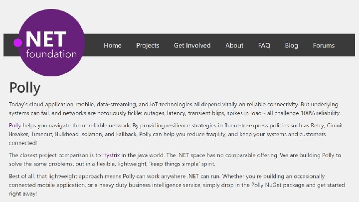 History of Polly 2013 Michael Wolfenden invents Polly. 2014 Targets multi. NET versions including PCL. 2015 Scott Hanselman (Microsoft) recommends Polly! Thoughtworks (Martin Fowler et al) recommend Polly! Nov 2015 App-v. Next take stewardship Dec 2015 Full async support April 2016 Advanced circuit breaker. Circuit health reporting. June 2016 Handle return values as faults. July 2016. NET Core /. NET Standard support. October 2016 Timeout, Bulkhead Isolation, Fallback, Policy. Wrap 2017 Mutable context with executions, Policy. Registry, Cache