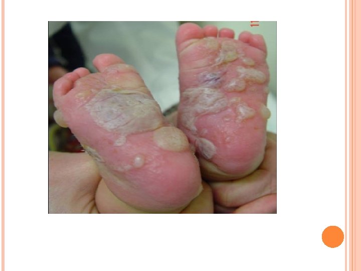 CHRONIC BULLOUS DISEASE OF CHILDHOOD Epidemiology Age of Onset: Under age 5 years Pathophysiology Autoimmune bullous disorder Variant of Linear Ig. A Dermatosis (seen in adults) Symptoms Pruritus and burning sensation Signs Tense inflamed Blisters over red base May appear as collarettes of Blisters Distribution Most commonly found on genitalia Also may involves face and perioral skin Oral Mucosa involved in 50% of cases
