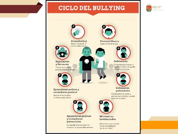 Indicadores de detección de los acosadores • • Agresividad verbal y/o física. Insultos. Bajo autocontrol. Acoso psicológico Actitudes agresivas como miradas o gestos. Amenazas. Impulsividad. Abuso de poder.
