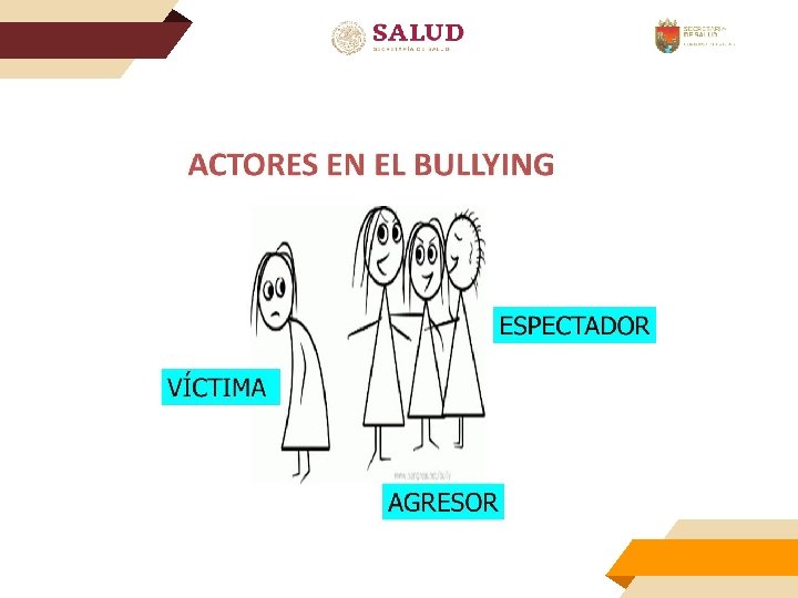 ACTORES Víctima Acosador Vulnerabilidad: timidez, introversión, inseguridad Características físicas peculiares Alto nivel de ansiedad e inseguridad. Temperamento impulsivo y agresivo (maleducado) Suelen ser de ritmo rápido (atención en el ritmo de vida) Deficientes habilidades sociales Falta de control de la ira, poca tolerancia a la frustración (mecanismos de defensa) Autosuficiente y baja autoestima – detectar abastecedores de autoestima Carencia de fuertes “lazos básicos” (papá y mamá) Testigos Permisivos, carácter vulnerable, conocen al agresor y los momentos en que va a agredir, juegan el papel de cómplices, miedo a ser próxima víctima y sensación de impotencia.