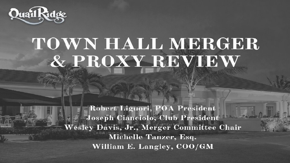 SIMPLIFY OUR GOVERNANCE MODEL AFTER A MERGER? QQUAIL RIDGE BOARD QQUAIL RIDGE EXECUTIVE COMMITTEE QQUAIL RIDGE FINANCE COMMITTEE QSEVEN QUAIL RIDGE COMMITTEES (FITNESS &TENNIS, GOLF &GREEN, HOUSE & ACTIVITIES, BYLAWS, CONDUCT, MEMBERSHIP &MARKETING, LONG RANGE) QCONDOMINIUM ASSOCIATION BOARD (21 LOCAL AREAS) QONE CONDO BOARD COMMITTEE (ARB) QTWO JOINT COMMITTEES (INSURANCE &SAFETY, LANDSCAPING)