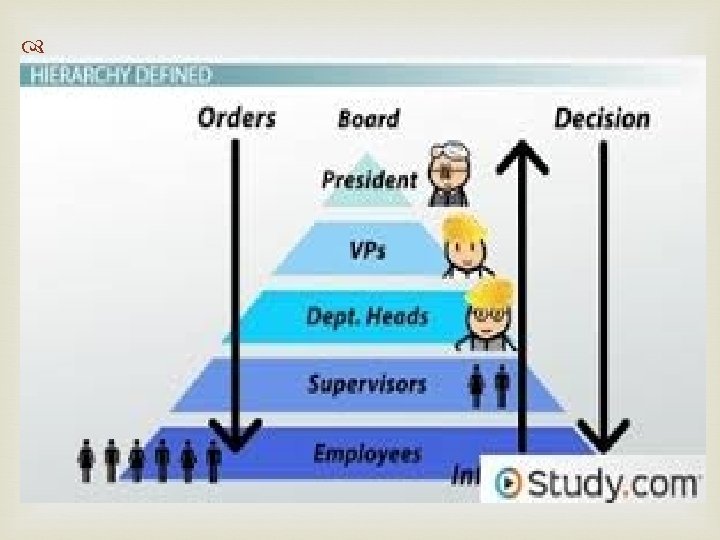Bureaucracy, in its simplest form, can be seen as "officials in power" or "a class of officials" or "bureaucrats exercising their power to carry on their constitutional duties and obligations ". The need, to use as an equivalent to the term "officials" or "administrators”. Features of Bureaucracy 1. Hierarchy: , Bureaucracy is hierarchical. It is based on rank. Each rank or position is subordinate to some and superior to some other. The bottom to the top, generally, makes for a pyramidal structure with the lower ranks concentrated at the bottom and the higher ranks at the top.