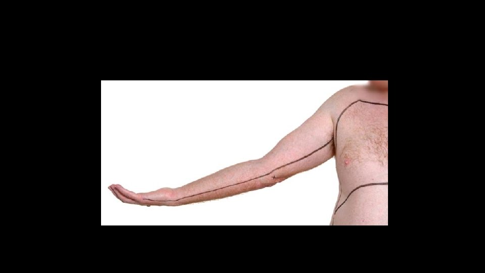 Escharotomy Upper Extremity • In the upper extremities, place the hand in the anatomic position (palm facing forward) and make an incision in the mid radial or mid ulnar line, carrying the incision up the arm. Ulnar incisions should stay anterior (volar) of the elbow joint to avoid the ulnar nerve, which is superficial at the level of the elbow