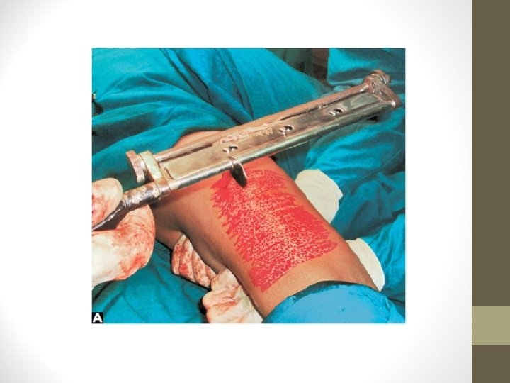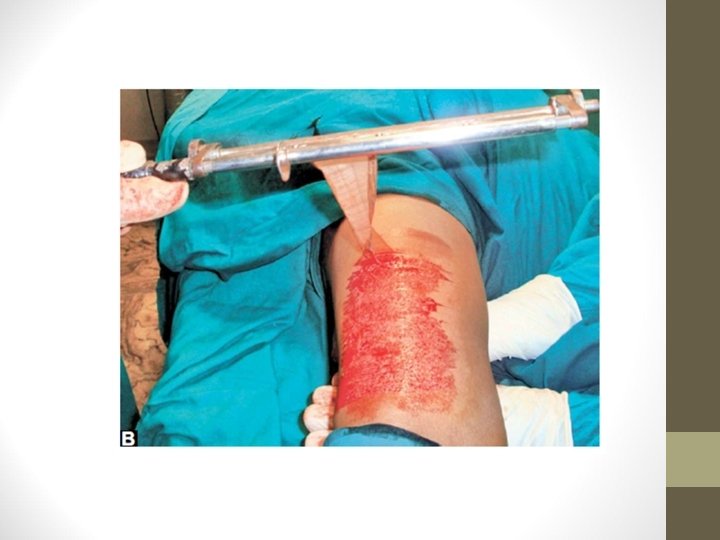 Deep burns ( deep 2 nd degree and 3 rd degree) • Early excision • Tangential • Sequential • Followed by • SSG • Full thickness graft