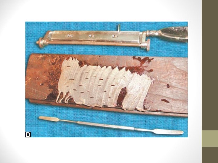 Technique • Donor sites: Thigh, arm, leg, forearm • Blade is Eschmann blade, Down’s blade • Using Humby’s knife graft is harvested • Punctate bleeding is observed which says that proper graft has been obtained