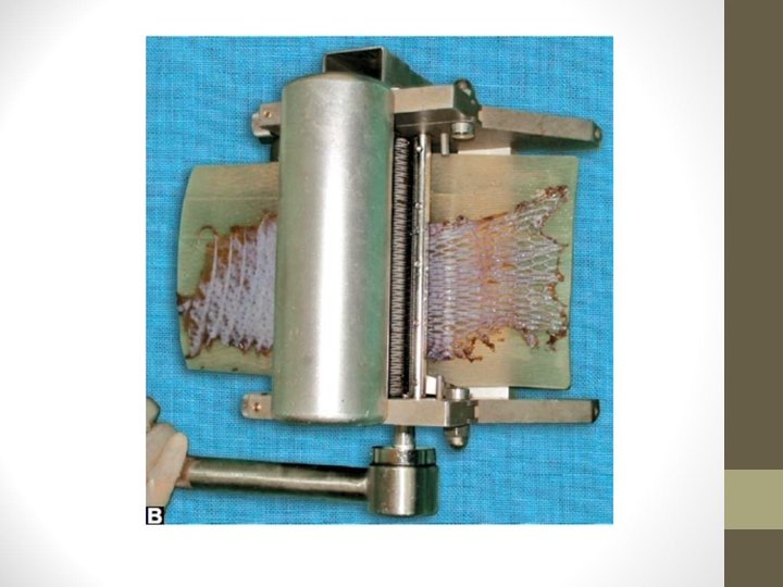 Advantages • Technically easier • Wide area of recipient can be covered • To cover large area like burns wound, graft size is increased by passing the graft through a Mesher which gives multiple openings to the graft, which can be stretched on the wider area like a net. It can cause expansion upto 6 times • Graft take up is better • Donor area heals on its own