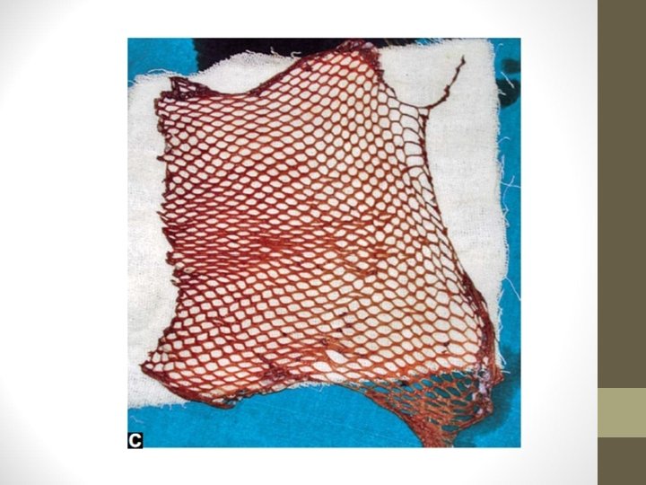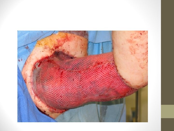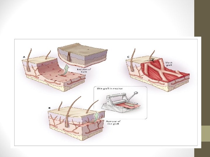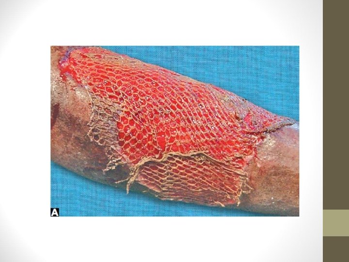 GRAFTING • Split thickness graft (SSG) • Done in 2 nd and 3 rd degree burns • Meshed graft used for large surface area • Thicker SSG more cosmetically accepted • Full thickness grafts • Used in small areas of cosmetic importance like face, hands