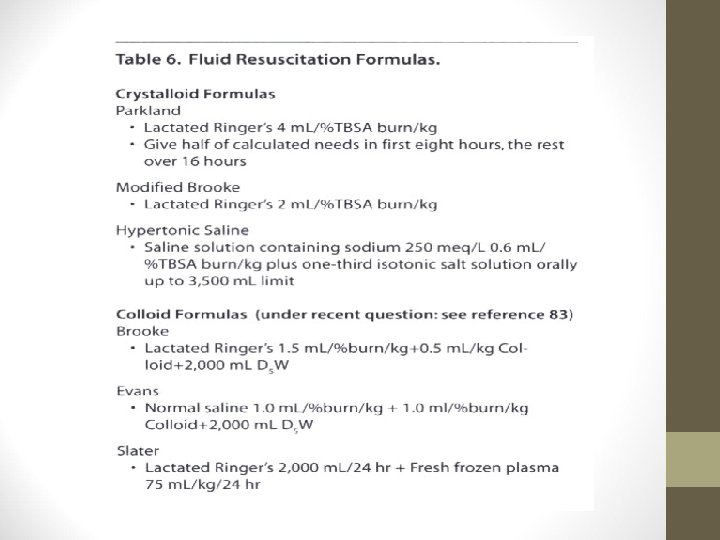 • Moderate – Partial thickness 15 -20% – Full thickness 2 -10% • Severe – – Partial thickness > 25% Full thickness > 10% Involving eyes, ears, feet, hands, perineum Burns with trauma
