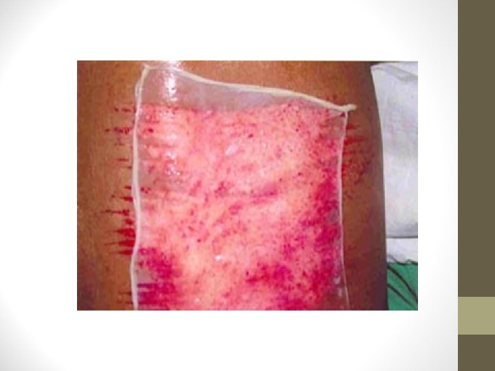 Collagen dressing • Indications • Deep 2 nd degree (non infected) • 3 rd degree burns as temporary covering after surgery • Advantages • Adheres to raw surfaces • Peels off as wound heals and epithelisation occurs • Promotes healthy granulation tissue in deep wounds