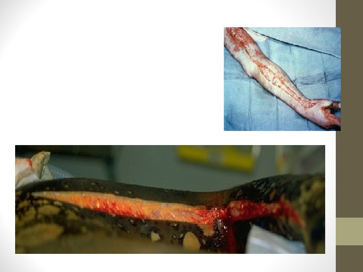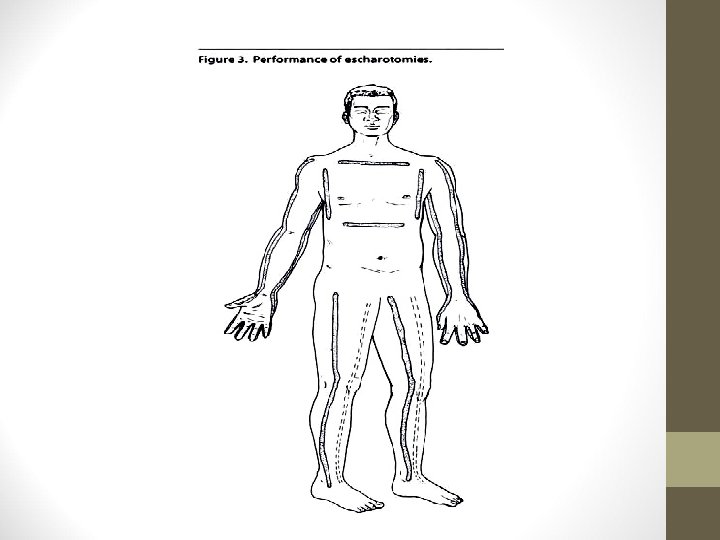Escharotomy • Cut the burned skin to relieve the underlying pressure • Cut along the inside or outside of the limb • Knife or cautery is used