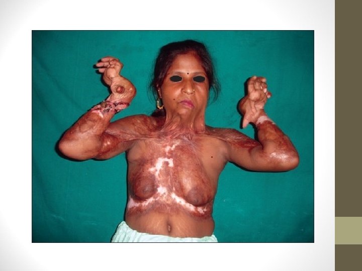 CHRONIC PROBLEMS • Post- burns contracture • Wound shortening • Can be intrinsic by loss of tissue or extrinsic by pull during healing phase • Hypertrophic scar • Seen in 2 nd and 3 rd degree burns allowed to heal by primary intention or delayed excision • Initial pressure therapy followed excision and grafting