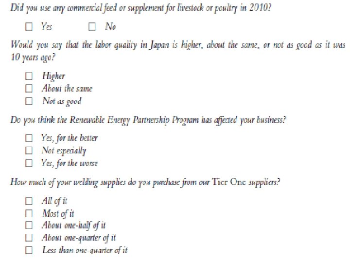 • What Is the Best Question Sequence? Order bias can result from a particular answer’s position in a set of answers or from the sequencing of questions. Funnel technique from general to specific Filter question minimizes the chance of asking questions that are inapplicable. Asking a human resource manager “How would you rate third party administrator (TPA) of your employee health plan? ” may elicit a response even though the organization does not utilize a TPA. The respondent may wish to please the interviewer with an answer. A filter question such as “Does your organization use a third party administrator (TPA) for your employee health plan? ” followed by “If you answered Yes to the previous question, how would you rate your TPA on. . . ? ” Pivot question, can be used to obtain income information and other data that respondents may be reluctant to provide. For example, “Is your total family income over or under 50, 000? ” IF UNDER, ASK, “Is it over or under 25, 000? ” IF OVER, ASK, “Is it over or under 75, 000? ”