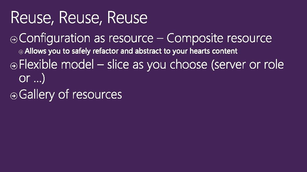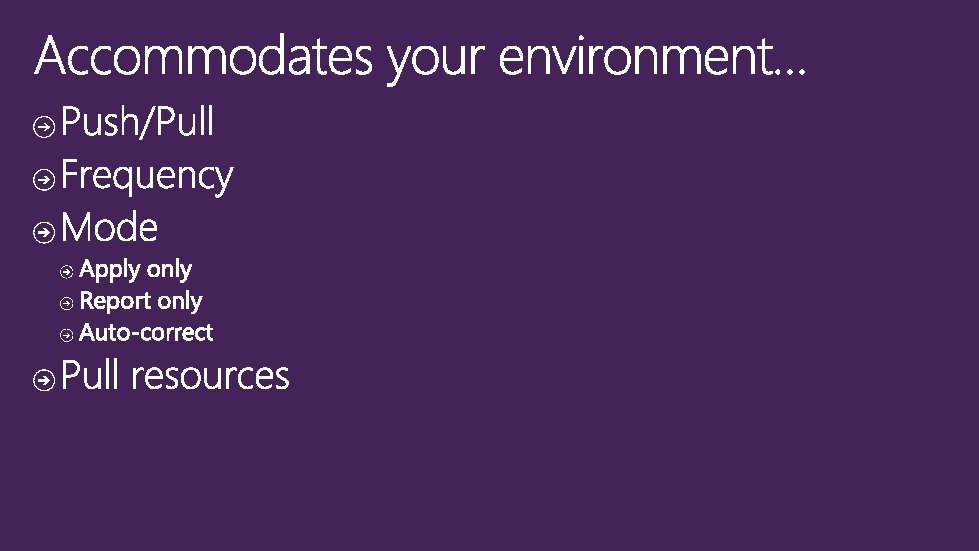 Push Authoring Phase (May include imperative as well as declarative code) Power. Shell 3 rd party languages and tools Staging Phase - Fully declarative configuration representation using DMTF standard MOF instances - Configuration is calculated for all nodes Configuration Staging Area (Contains DSC data) “Make it So” Phase (Declarative configuration is reified through imperative providers. ) Local Configuration Store Parser and Dispatcher Resources When authoring in Power. Shell: • Declarative syntax extensions • Schema-driven Intellisense • Schema validation (early-binding) Resources implement changes: • Monotonic • Imperative • Idempotent