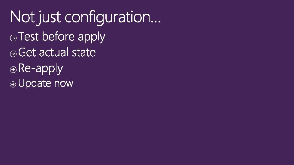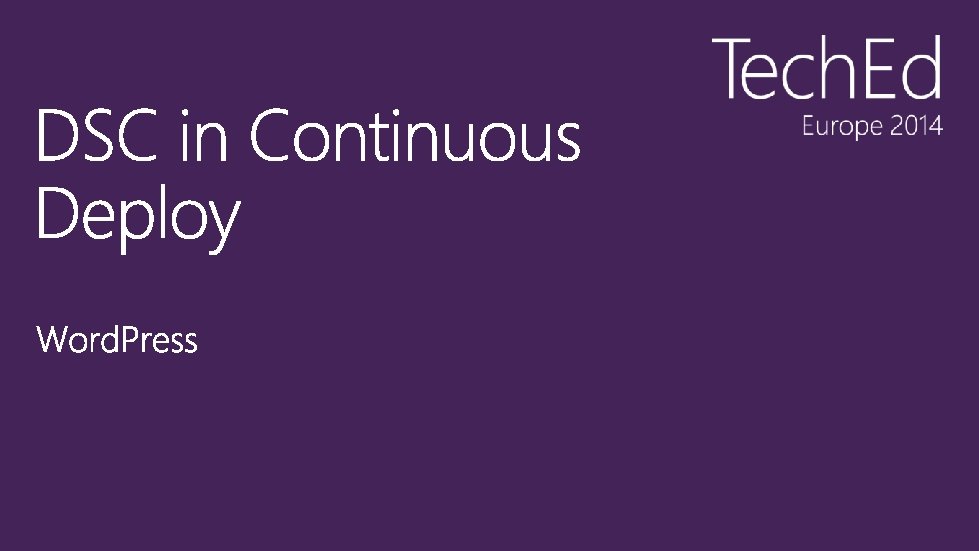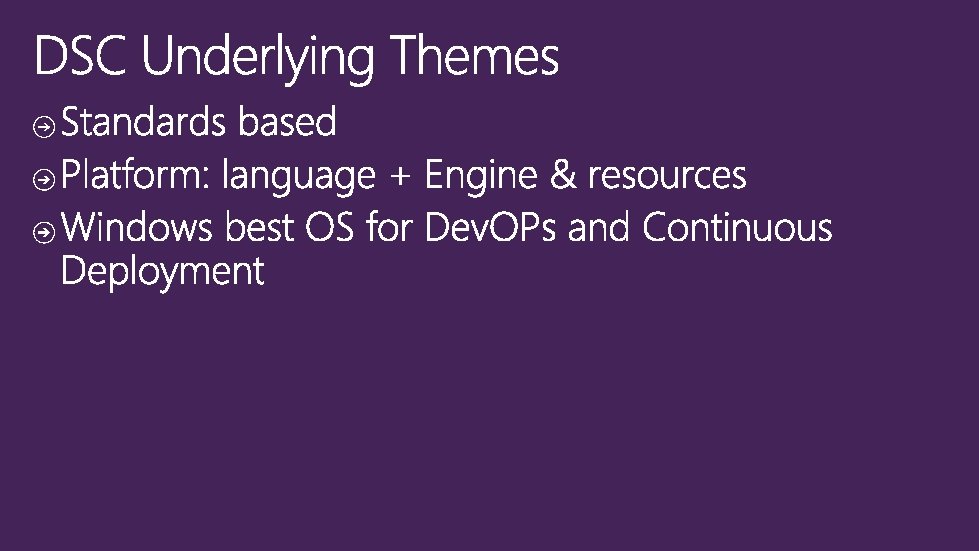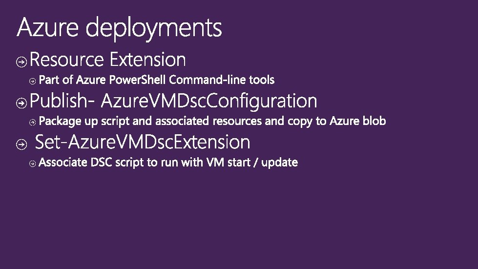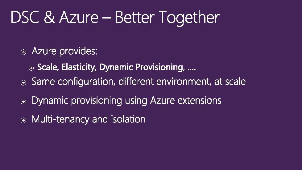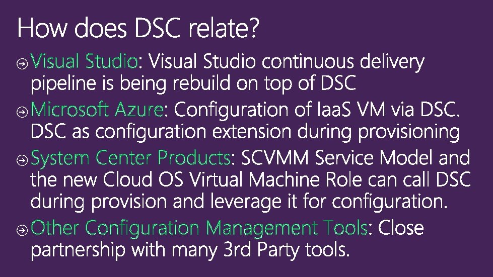 Azure • Manage Environment • VMs • Drives • Etc. • Json / xml DSC Azure Extension DSC • Manage Guest • Web Application • Operating system • Etc. • Power. Shell and MOF Continuous deployment tooling utilizing Azure and DSC Such as Visual Studio, Brewmaster, etc.
