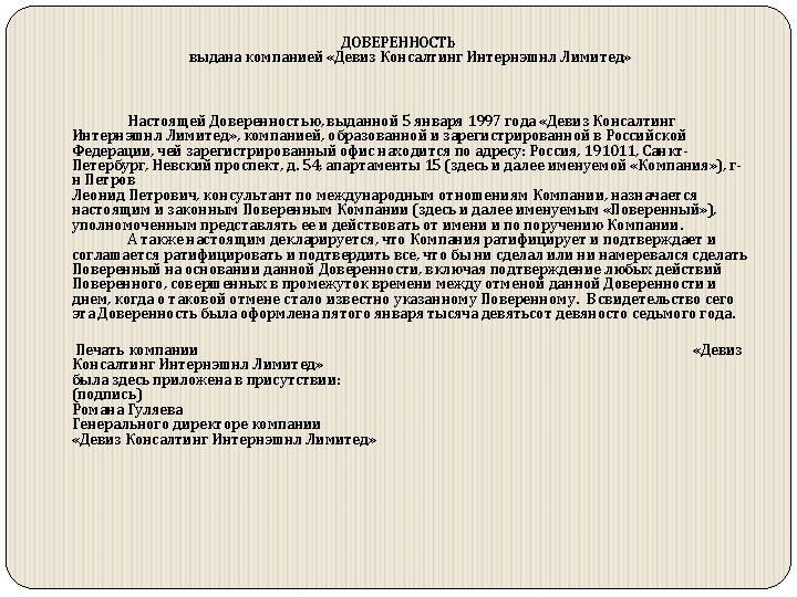 POWER OF ATTORNEY By Deviz Consulting International Limited By this Power of Attorney given on the 5 day of January 1997 Deviz Consulting International Limited, the company incorporated and registered in the Russian Federation, having its registered office at: 54 Nevsky Prospect, Suite 15, St. Petersburg, 191011, Russia (hereinafter called "the Company") hereby appoints Mr. Leonid Petrovich Petrov, Consultant on International Affairs of the Company, the true and lawful Attorney (hereinafter called "the Attorney") of the Company to represent and act in the name and on behalf of the Company. And it is hereby declared that the Company ratifies and confirms and agrees to ratify and confirm whatsoever the Attorney shall do or purport to do by virtue of this Power of Attorney including in such confirmation whatsoever shall be done between the time of revocation of this Power of Attorney and the time of that revocation becoming known to the said Attorney. In witness whereof this Power of Attorney has been executed this fifth day of January 1997. The common seal of Deviz Consulting International Limited was hereunto affixed in the presence of: (signature) Roman Gulyaev General Manager of the company Deviz Consulting International Limited