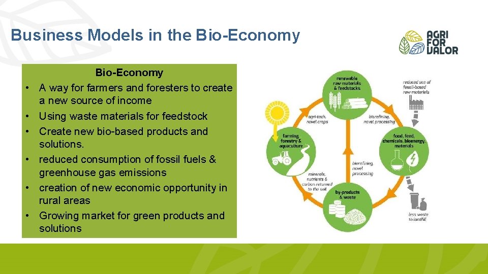 Business Models in the Bio-Economy • • • Bio-Economy A way for farmers and foresters to create a new source of income Using waste materials for feedstock Create new bio-based products and solutions. reduced consumption of fossil fuels & greenhouse gas emissions creation of new economic opportunity in rural areas Growing market for green products and solutions
