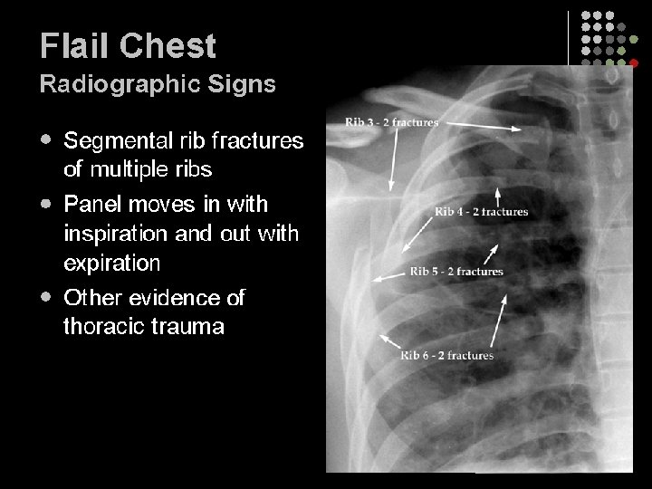 Flail chest • Definition: 3 or more consecutive rib facture in 2 or more place producing free Floating/unstable segment. • Classification: Anterior flail chest Lateral type