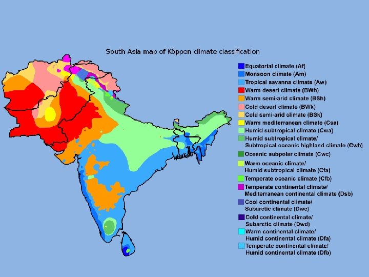 Besides capital letters he used various small letters in his climatic scheme f Precipitation through out year m Monsoon climate short dry season w Dry season in winter s Dry season in summer h Mean annual temperature above 18 degree c k Mean annual temperature below 18 degree c a Hot summer temp of warmest month above 22 degree c b Cold winter temperature of warmest month below 22 degree c c Cool short summer with less than four month over 10 degree c