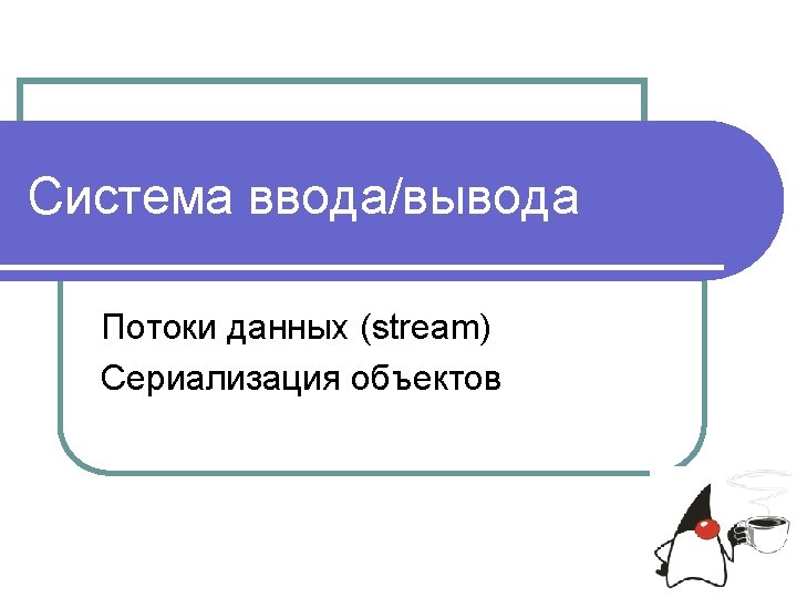 Пример Сериализация Десериализация Byte. Array. Output. Stream os =new byte[] b. Array =os. to. Byte. Array(); Byte. Array. Output. Stream(); //получение содержимого массива Object obj. Save =new Integer(1); Object. Output. Stream oos =new Object. Output. Stream(os); oos. write. Object(obj. Save); Byte. Array. Input. Stream is =new Byte. Array. Input. Stream(b. Array); Object. Input. Stream ois =new Object. Input. Stream(is); Object obj. Read =ois. read. Object(); При этом объекты равны по значению, но не равны по ссылке!!!