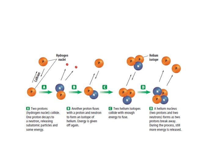 How do stars shine/generate energy? • Core of Sun → high temp → H atoms fuse into He → releases huge amt of energy • 4 H nuclei combine to create 1 He nucleus • Mass of 1 He nucleus < 4 H nuclei → mass is lost → energy is produced • E = mc 2 Eg: m=1 kg E = 1 x (3 x 108)2 = 9 x 1016 J → 2. 8 million US hours / year