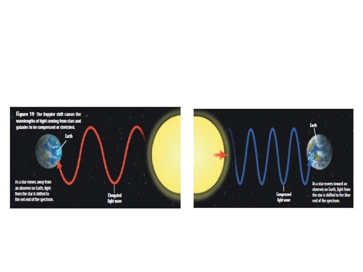 Doppler Shift • If a star is moving toward Earth, its wavelength of light are compressed →light from the star is shifted to the blue end of the spectrum. • If a star is moving away from Earth, its wavelength stretched →light from the star is shifted to the red end of the spectrum.