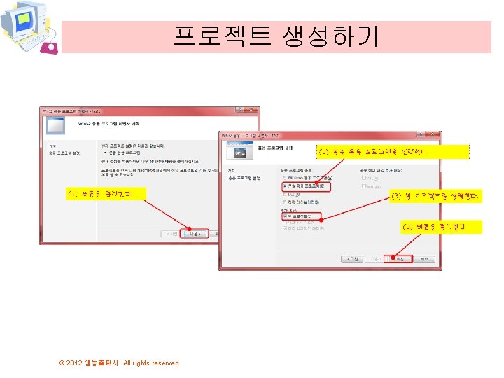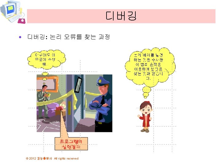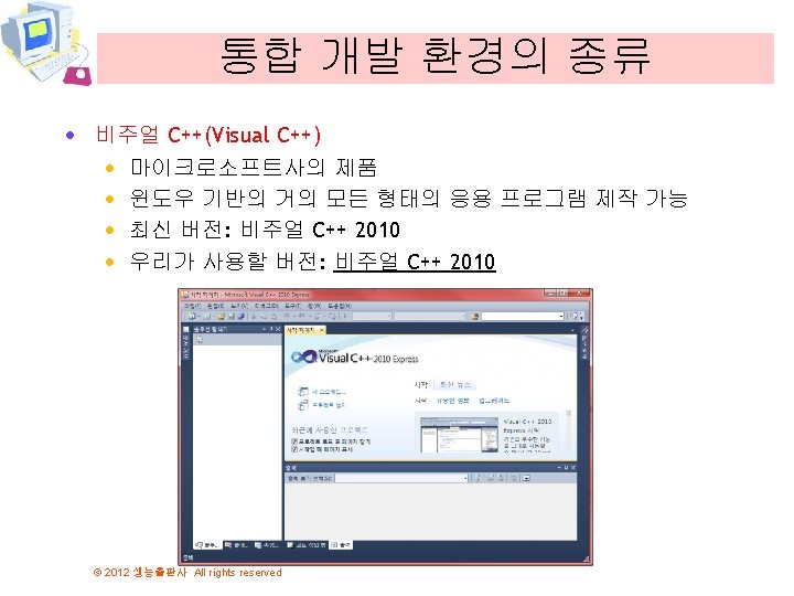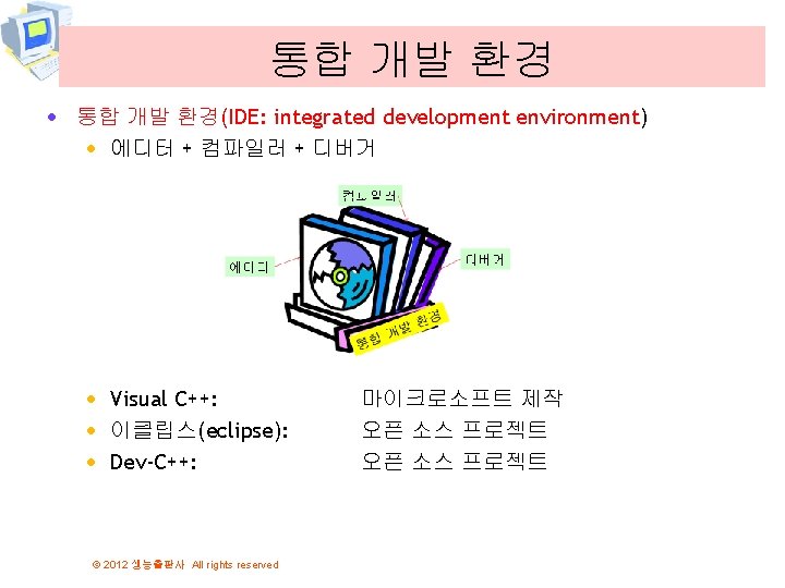 C 2012 All rights reserved 2012 All rights Slides: 50 Download presentation 비주얼 C++ 설치 © 2012 생능출판사 All rights reserved 프로그램 입력 © 2012 생능출판사 All rights reserved 프로그램 입력 © 2012 생능출판사 All rights reserved 전문가 설정 © 2012 생능출판사 All rights reserved 컴파일하기 © 2012 생능출판사 All rights reserved 첫번째 프로그램의 설명 #include <stdio. h> int main(void) { printf("Hello World!"); return 0; } © 2012 생능출판사 All rights reserved return 0; · return은 함수의 결과값을 외부로 반환합니다. 운영 체제 main() printf(“Hello World!”); return 0; 운영 체제 © 2012 생능출판사 All rights reserved 첫번째 버전 · 문장들은 순차적으로 실행된다는 사실 이용 #include <stdio. h> int main(void) { printf("Hello World!"); printf("Kim Chul. Soo"); return 0; } © 2012 생능출판사 All rights reserved 2개의 문장은 순차적으 로 실행된다. 변경된 프로그램 · 줄바꿈 문자를 포함하면 우리가 원하던 결과가 된다. #include <stdio. h> int main(void) { printf("Hello World!n"); printf("Kim Chul. Soo n"); return 0; } © 2012 생능출판사 All rights reserved 오류 #1 #include <stdio. h> int main(void) { printf("Hello World!n") return 0; } © 2012 생능출판사 All rights reserved 문장의 끝 에 ; 이 없 음!! 오류 #3 #include <stdio. h> int main(void) { print("Hello World!"); return 0; } print가 아니 라 printf임 1>------ 빌드 시작: 프로젝트: hello, 구성: Debug Win 32 -----1> hello. c 1>c: userschundocumentsvisual studio 2010projectshellohello. c(6): warning C 4013: 'print'이(가) 정의되지 않았습니다. extern은 int형을 반환하는 것으 로 간주합니다. 1>hello. obj : error LNK 2019: _print 외부 기호(참조 위치: _main 함수)에서 확인하지 못했습니다. 1>c: UserschunDocumentsVisual Studio 2010ProjectshelloDebughello. exe : fatal error LNK 1120: 1개의 확인할 수 없는 외부 참조입니다. ===== 빌드: 성공 0, 실패 1, 최신 0, 생략 0 ===== © 2012 생능출판사 All rights reserved 논리 오류가 존재하는 프로그램 #include <stdio. h> int main(void) { printf("Hey!"); printf("Good Morning"); return 0; } © 2012 생능출판사 All rights reserved 줄이 바뀌지 않았음! 논리 오류가 수정된 프로그램 #include <stdio. h> int main(void) { printf("Hey! n"); printf("Good Morning n"); return 0; } © 2012 생능출판사 All rights reserved 논리 오류 수 정!! 디버거(debugger) © 2012 생능출판사 All rights reserved Q&A © 2012 생능출판사 All rights reserved