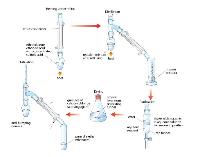 3. Impure product shaken with aqueous reagents - this removes impurities. Mixture placed in a tap funnel and lower product layer collected 4. Drying - granules of calcium chloride added to remove impurities 5. Distillation - pure dry ethyl ethanoate collected from distillate due to lower b. p