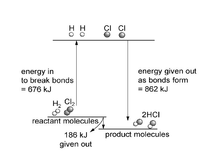 3. Hydrogen burns in chlorine. H 2(g) + Cl 2(g) 2 HCl(g) a b c Which bonds are broken during the reaction? Which bonds are made during the reaction? Use the data in the table to calculate the overall energy change for the reacting masses shown in the equation. Is d. Is this reaction exothermic or endothermic? e Draw an energy-level diagram for the reaction. Bond Energy change for the formula masses (k. J) H—H 434 Cl—Cl 242 H—Cl 431