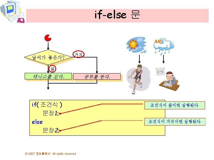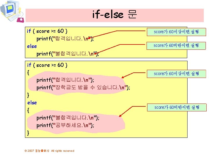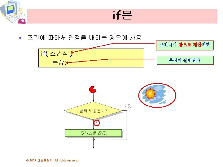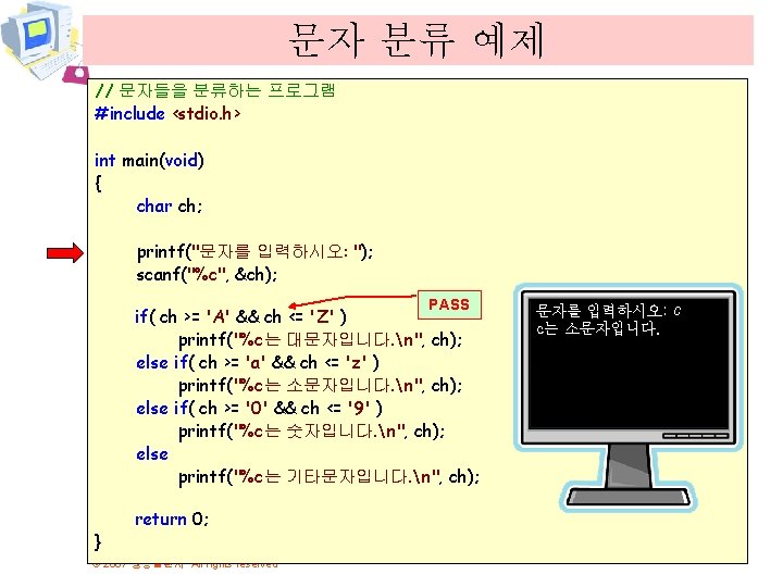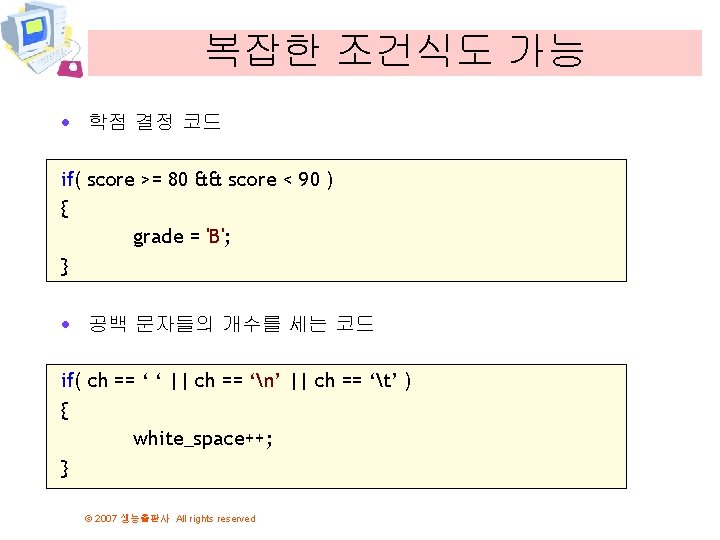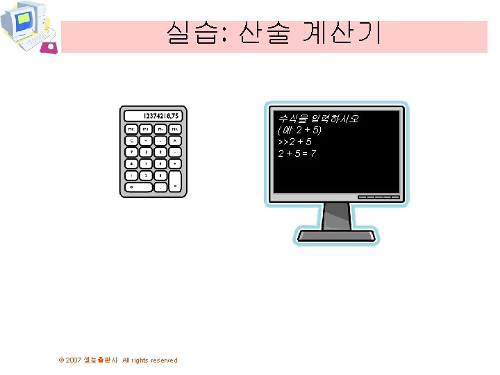 소스 #include <stdio. h> int main(void) { char op; int x, y, result; printf("수식을 입력하시오"); printf("(예: 2 + 5) "); printf(">>"); scanf("%d %c %d", &x, &op, &y); 수식을 입력하시오 (예: 2 + 5) >>2 + 5 if( op == '+' ) 2+5=7 result = x + y; else if( op == '-' ) result = x - y; else if( op == '*' ) result = x * y; else if( op == '/' ) result = x / y; else if( op == '%' ) result = x % y; else printf("지원되지 않는 연산자입니다. "); printf("%d %c %d = %d ", x, op, y, result); return 0; © 2007 생능출판사 All rights reserved }
