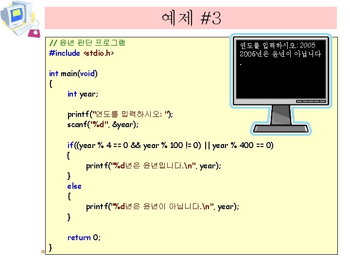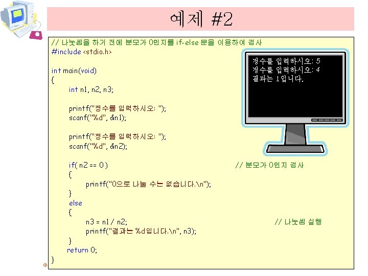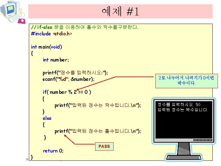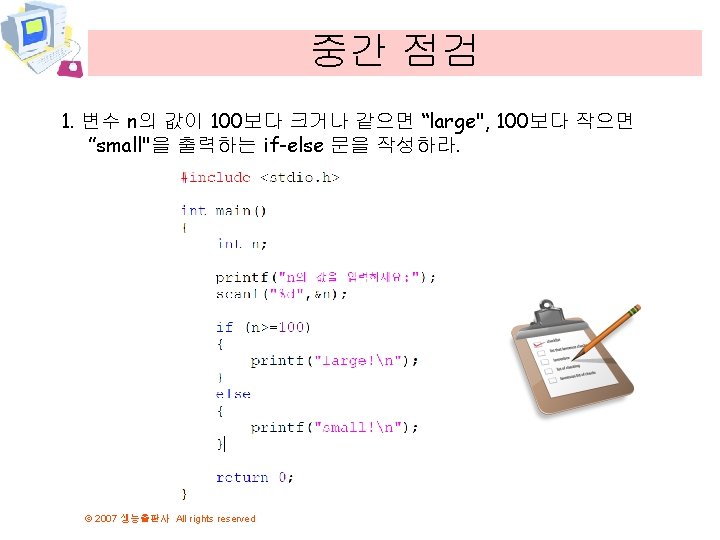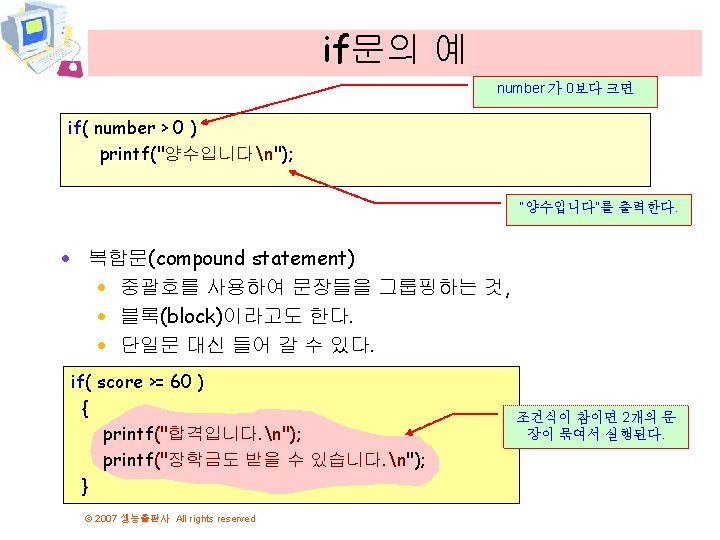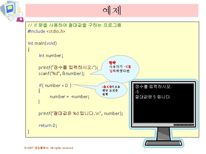 예제 #include <stdio. h> int main(void) { int number; printf("정수를 입력하시오: "); scanf("%d", &number); if( number > 0 ) { printf("양수입니다. "); } 정수를 입력하시오: 25 양수입니다. 입력된 값은 25입니다. printf("입력된 값은 %d입니다. ", number); return 0; } © 2007 생능출판사 All rights reserved