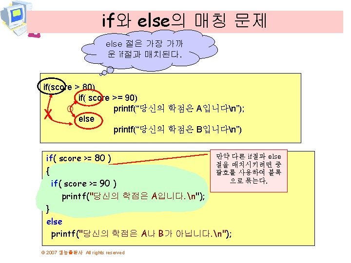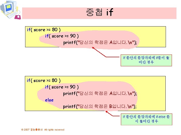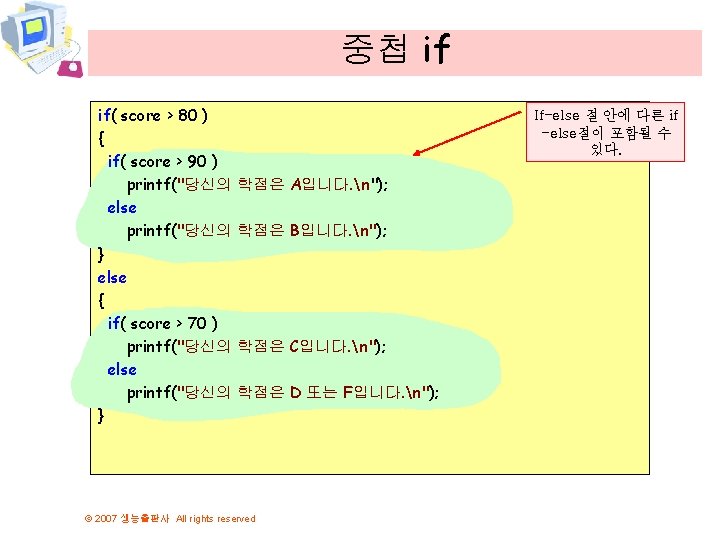 학점 결정 예제 #include <stdio. h> int main(void) { int score; printf("성적을 입력하시오: "); scanf("%d", &score); } if (score >= 90) printf("합격: 학점An"); else if (score >= 80) printf("합격: 학점Bn"); else if (score >= 70) printf("합격: 학점Cn"); else if (score >= 60) printf("합격: 학점Dn"); else printf("불합격: 학점Fn"); return 0; © 2007 생능출판사 All rights reserved 성적을 입력하시오: 88 합격: 학점 B
